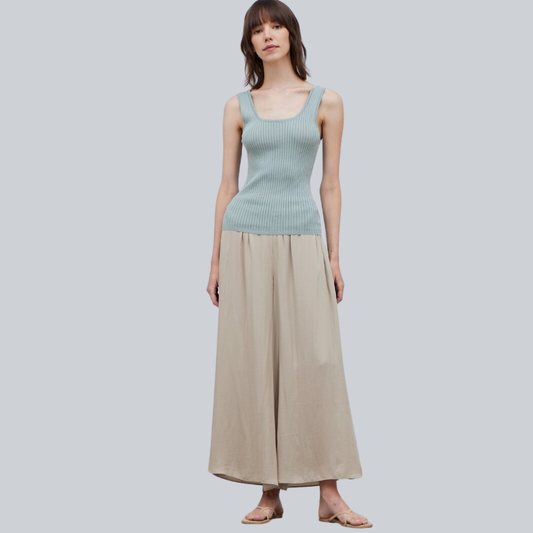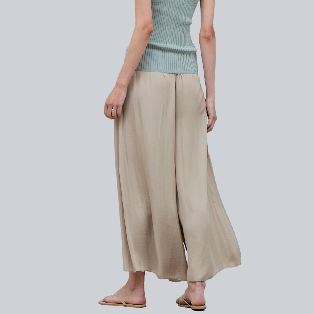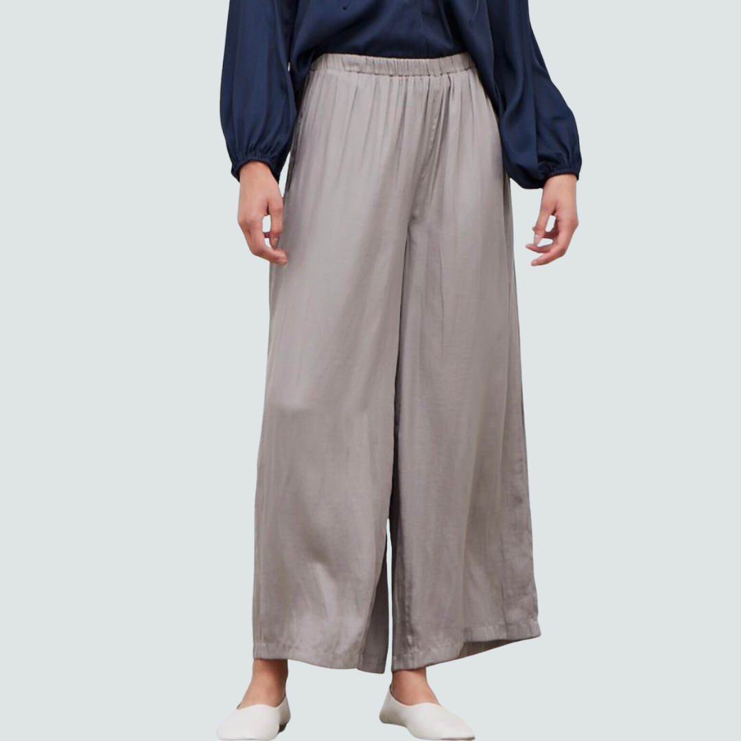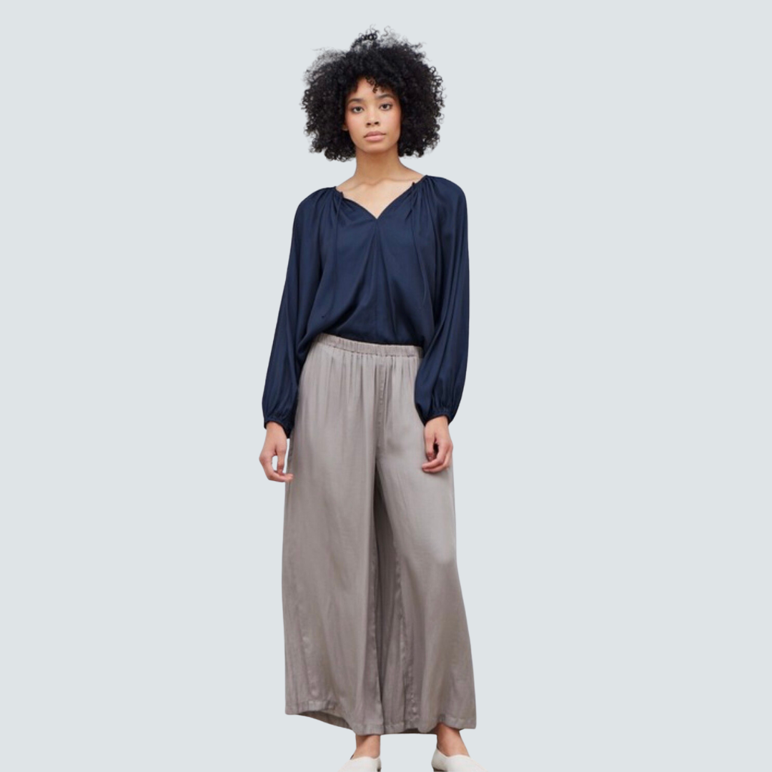 We love these pants! Very light and airy, side pockets, elastic waistline.