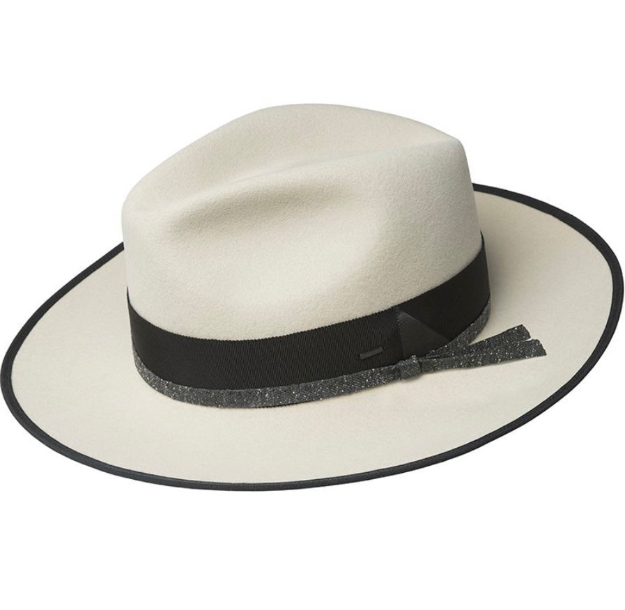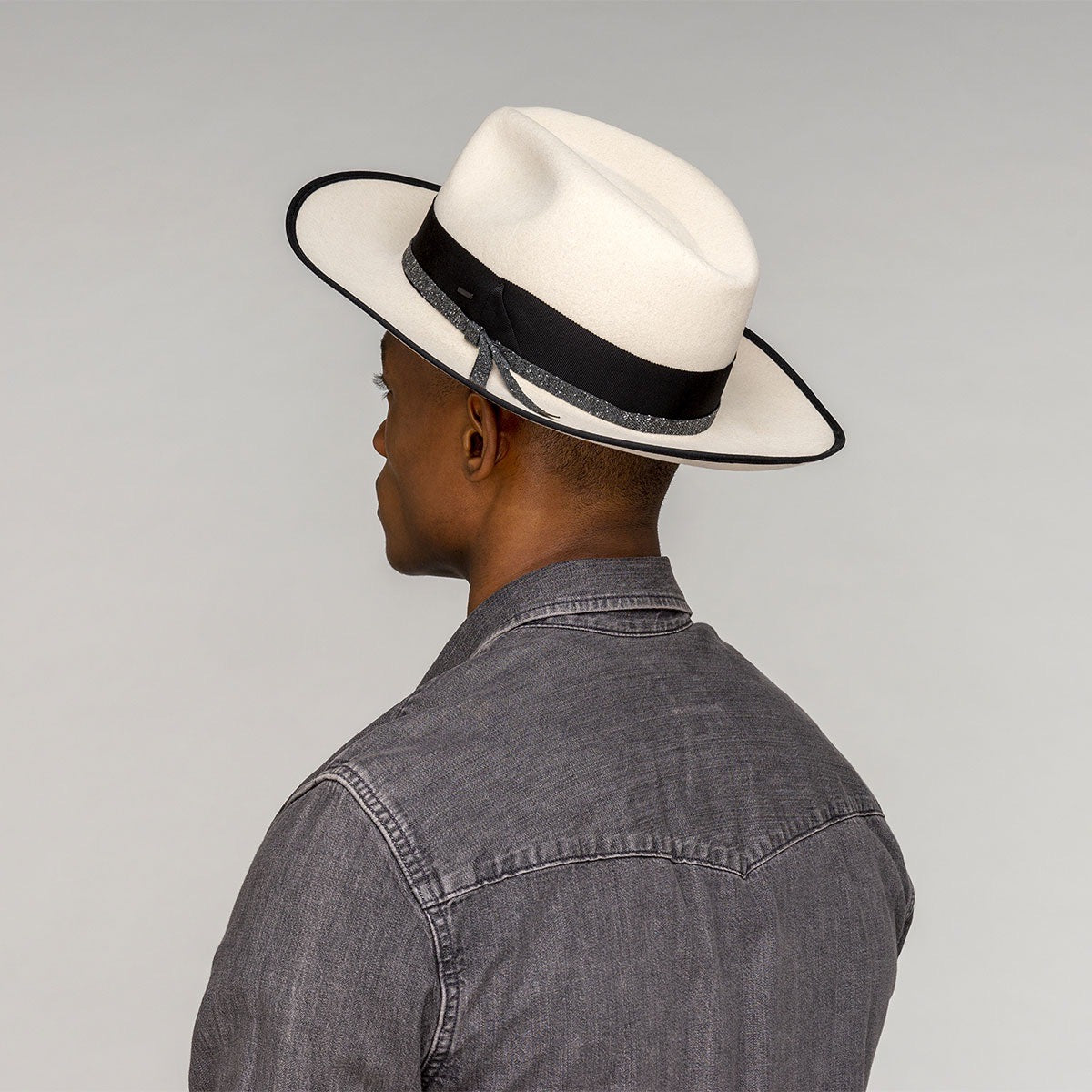 The Clorindon is a grad crown style with a 3" wide flat brim. It is trimmed with a wide Japanese grosgrain band and overlaid with a silk blend, heathered, narrow ribbon for added texture. The brim is also bound with our grosgrain for a sleek and modern look.