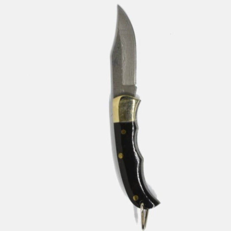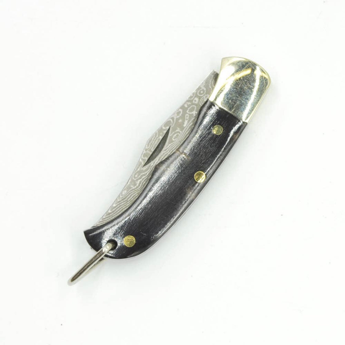 | 100% black ox-horn inlay. Damascus steel blade. 1 3/4in folded |