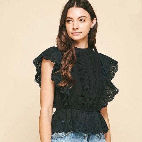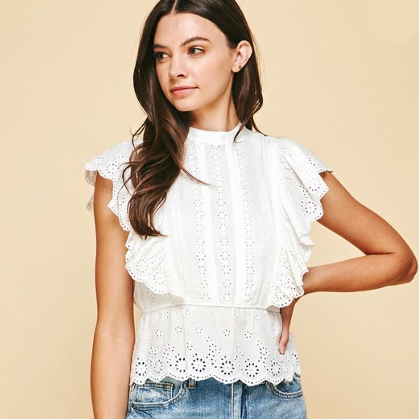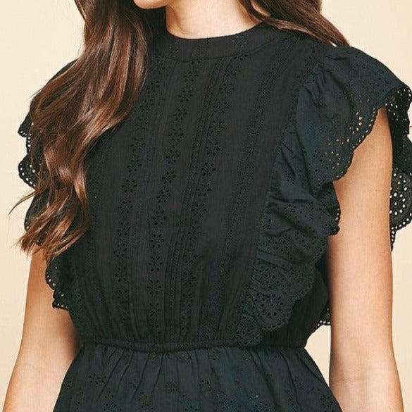 Eyelet top, elastic high waist, ruffles around the sleeve and bodice, top button closure on back.