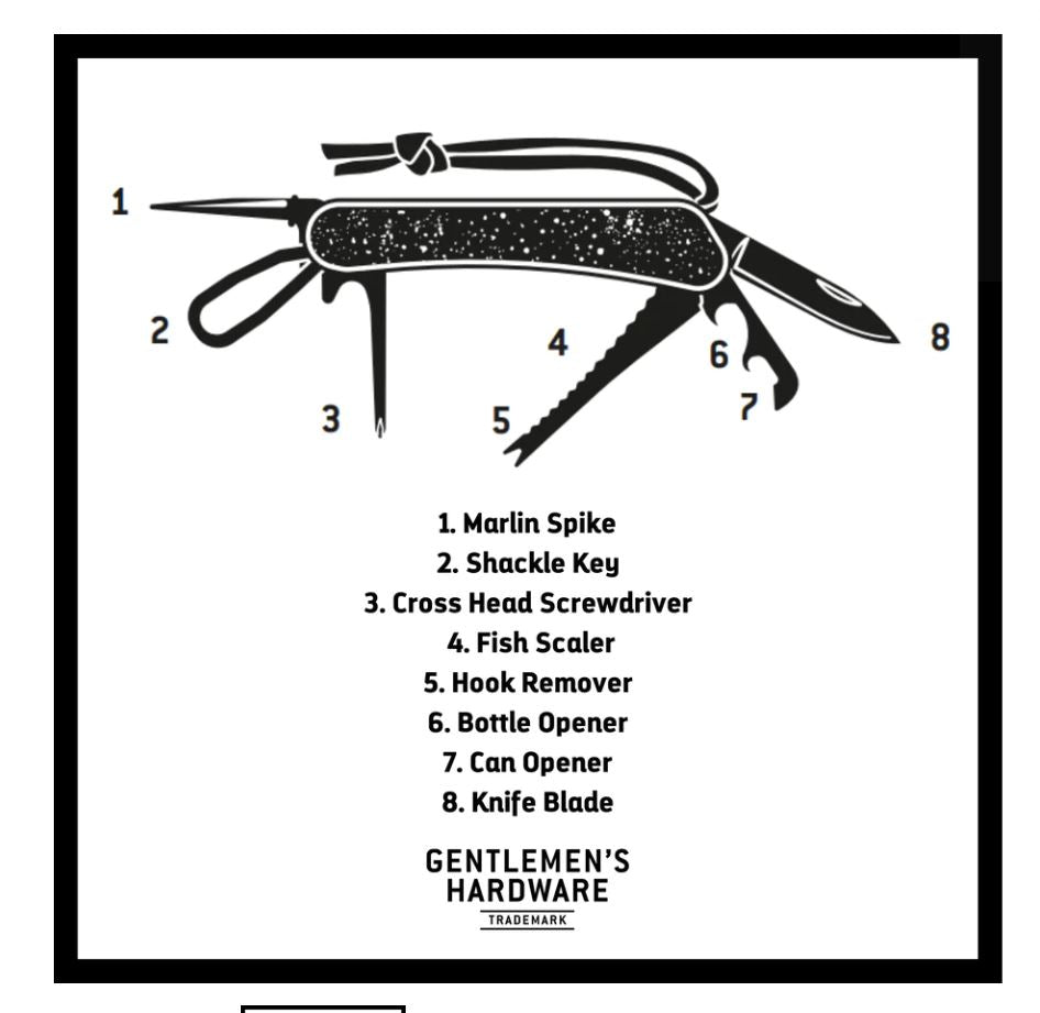 - Includes Fish Scaler and Hook Remover, Shackle Key, Phillips Screwdriver, Knife Blade, Tin/Bottle Opener and Marlin Spike