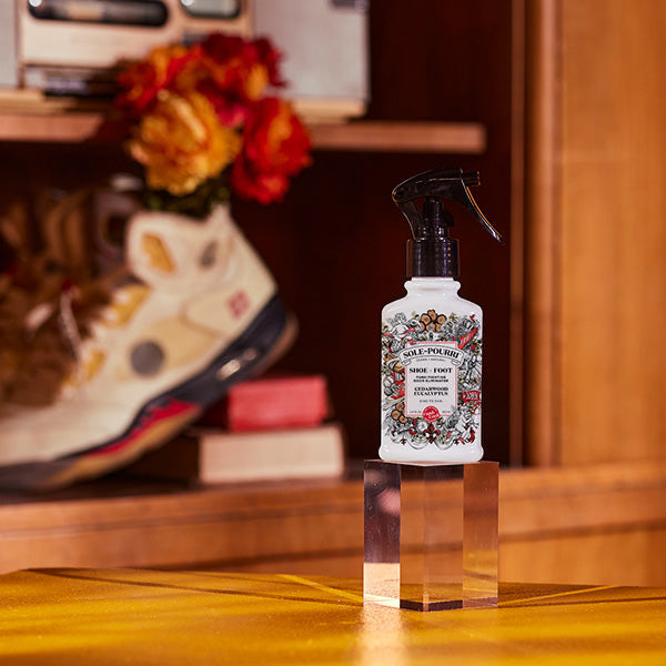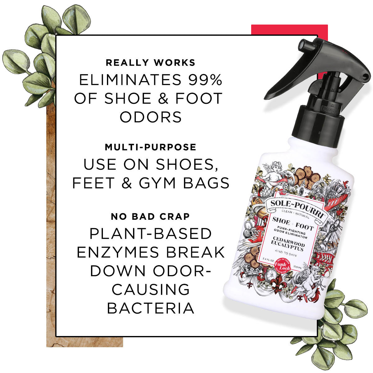 Sole-Pourri Spray Foot Odor Refresher Cedarwood Eucalyptus Shoe + Foot, 3.4 oz. Give your shoes and feet a breather! Freshen the funk—don’t mask it. Harness the power of natural cedarwood, eucalyptus, and plant-based enzymes to leave your feet and shoes smelling like a forest—always fresh, never funky. Sole-Pourri is a clean and plant-based formula that works instantly to provide long-lasting freshness on shoes and feet with our proprietary Funk Lock technology™. Made with essential oils such as Eucalyptus and Cedarwood to fight against stinky shoes and foot odor. Safe to use on skin, Vegan formula, and Leaping Bunny Certified - never tested on animals. Only Stinky Humans! Our 3.4 oz spray bottle includes a trigger sprayer for ease.