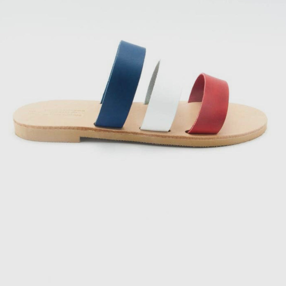 Blue red and white leather, natural tan leather insole, eva out sole. Premium quality natural tan leather insole with anti-slippery eva outsole. 0.27" heel. Made in Greece.