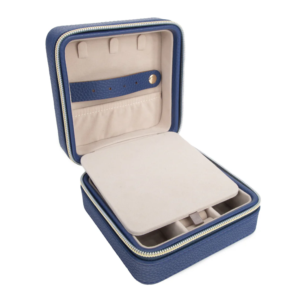 This square zippered case will solve all your jewelry transport problems. Made of a durable and flexible vegan material with a soft linen lining, it features multiple layers to hold earrings, bracelets, necklaces and other jewels, keeping them safe and contained while traveling. Brouk & Co.